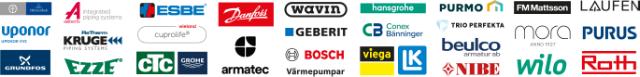 Aalbert Industry, Armatec, Beulco, Bosch, Conex/Bänninger, CTC Enertech, Danfoss, Esbe, Ezze, FM Mattsson, Geberit, Grohe, Grundfos, Gustavsberg, Hansgrohe, Laufen, LK Systems, Mora Armatur, Nibe, Purmo, Purus, Retherm Kruge, Roth, Trio Perfekta, Uponor VVS, Viega, Wavin, Wieland (Cuprolife) och Wilo.