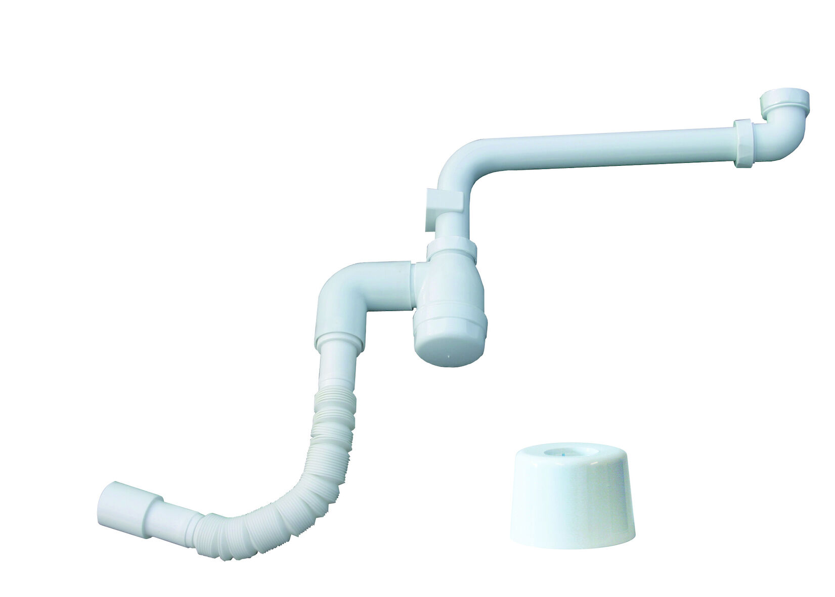 Vattenlåssats för anslutning i golv/vägg avsedd för tvättställsskåp där vattenlåset flyttas in i skåpets bakkant och stör då inte utformningen på inredningen. Man kan utnyttja skåpets ytor på ett effektivare sätt. Vattenlåssatsen leveras komplett med golvhuv och rörklämma.