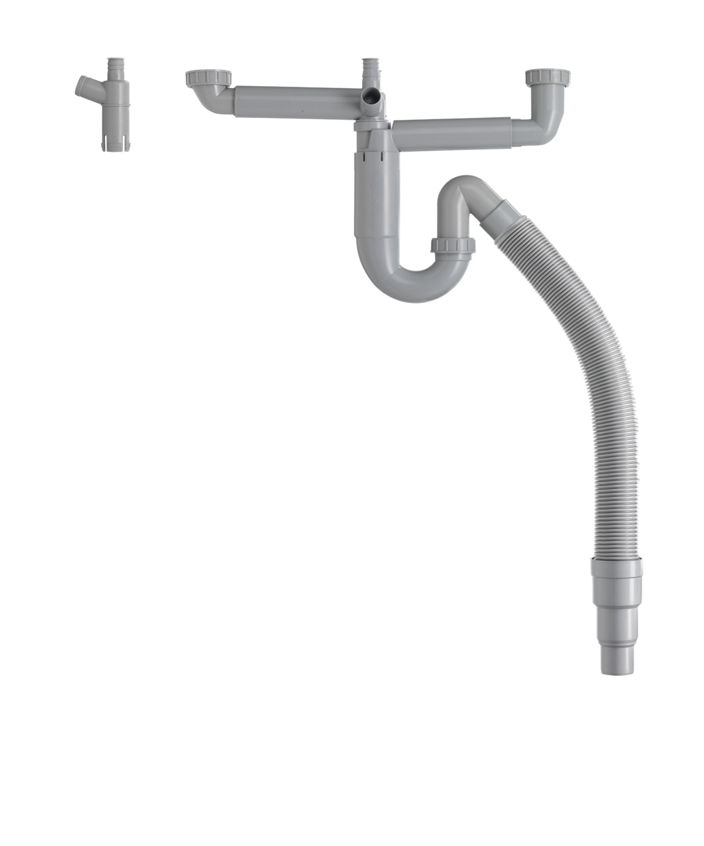 Vattenlås rotmodell ommonteringsbart mellan enkel och dubbelmontage med flexibel utloppsslang