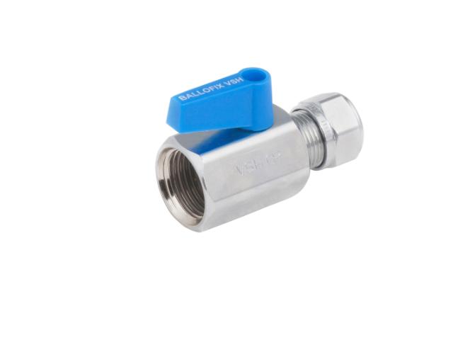 VSH Mini 1405 Rak kulventil 15xR15, med klämring x invändig gänga förkromad med vred
