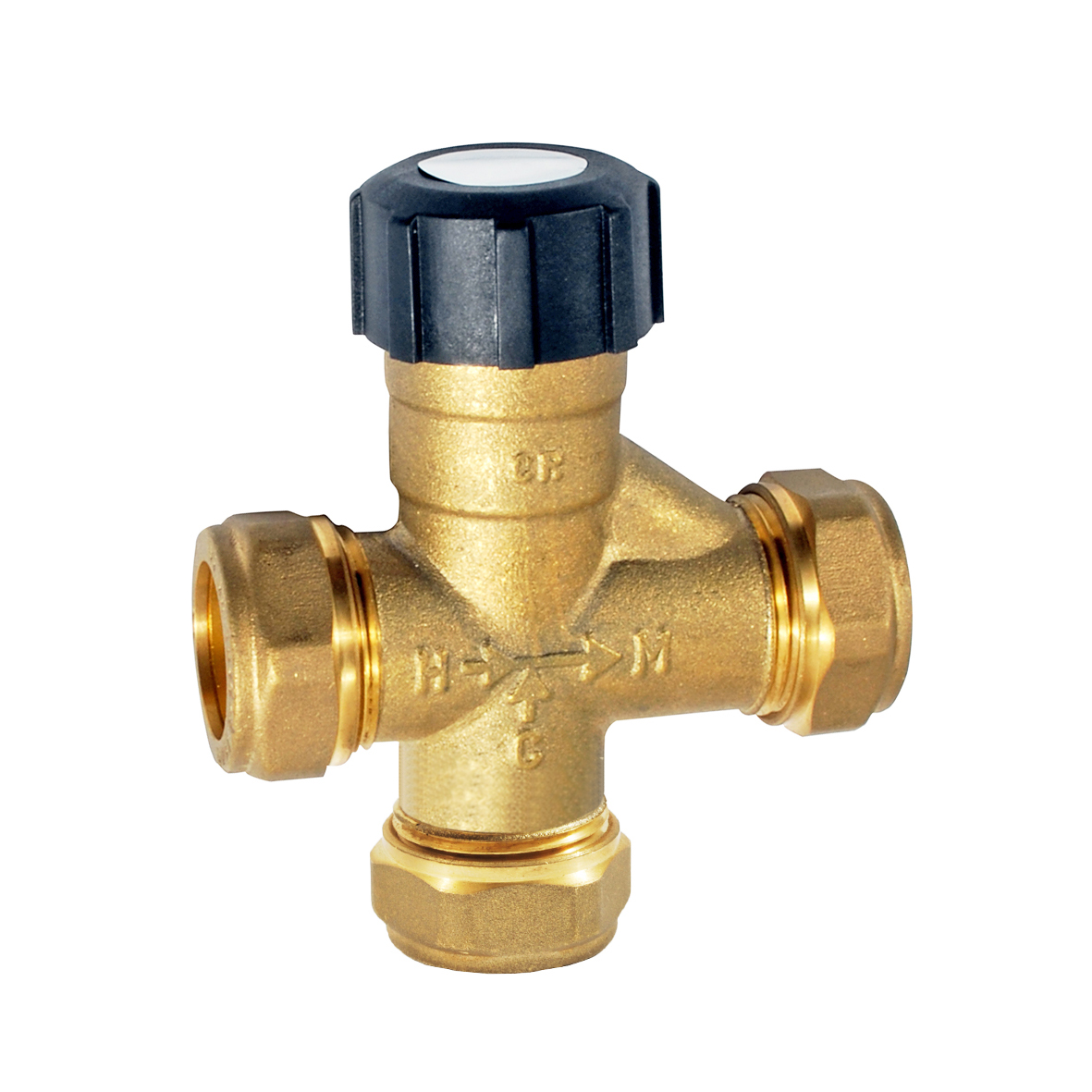 Med tre klämringskopplingar. Reglerområde 35-65°C. Levereras med backventil för instick i utgående rör.