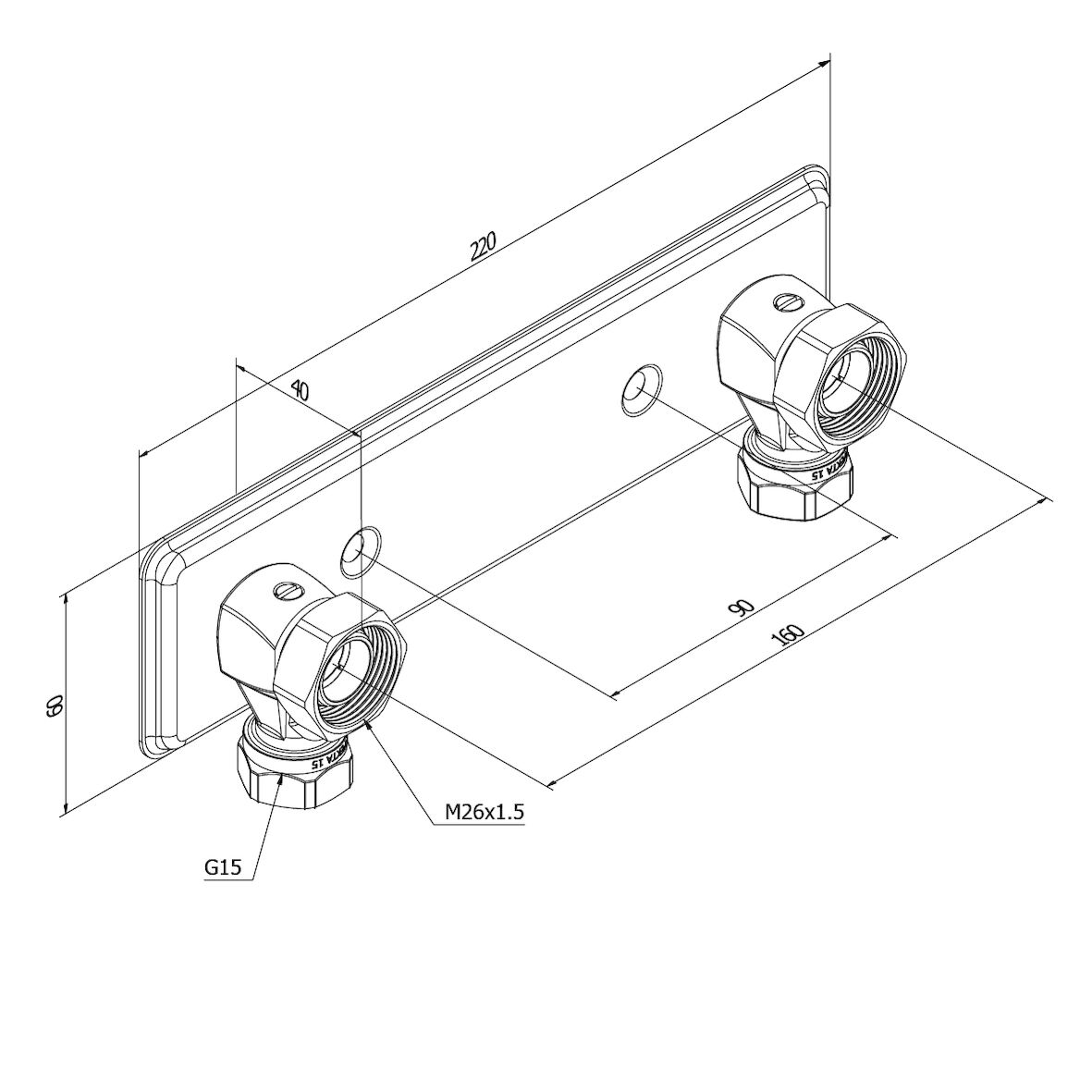 Rostfritt, blankpolerat blandarfäste 160 cc för utanpåliggande rördragning, med vridbara anslutningsvinklar och avstängning. Anslutning mot blandare M26x1,5 och inlopp G15. Inkluderar klämringskopplingar för 12/15-rör och VVS-skruv.