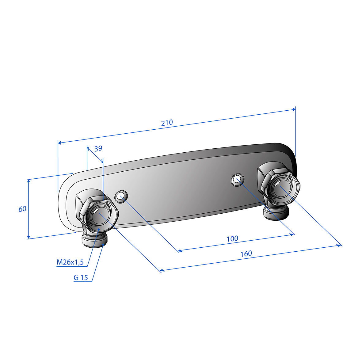 Rostfritt blandarfäste 160 cc för utanpåliggande rördragning, med vridbara anslutningsvinklar. M26x1,5 och inlopp G15. Med plantätning för halvkopplingar. Inkl. VVS-skruv.