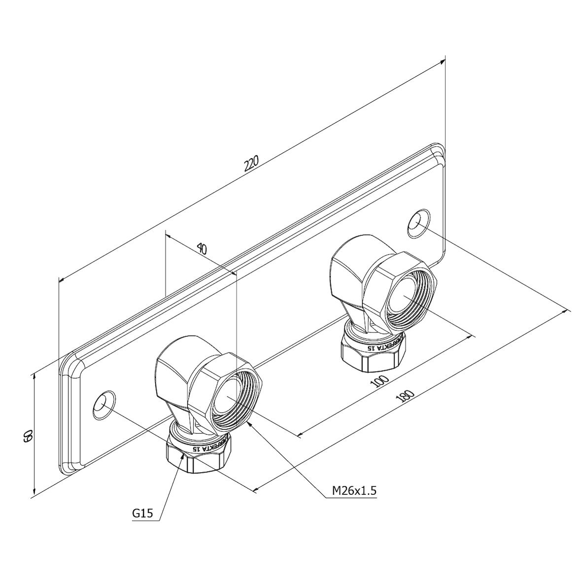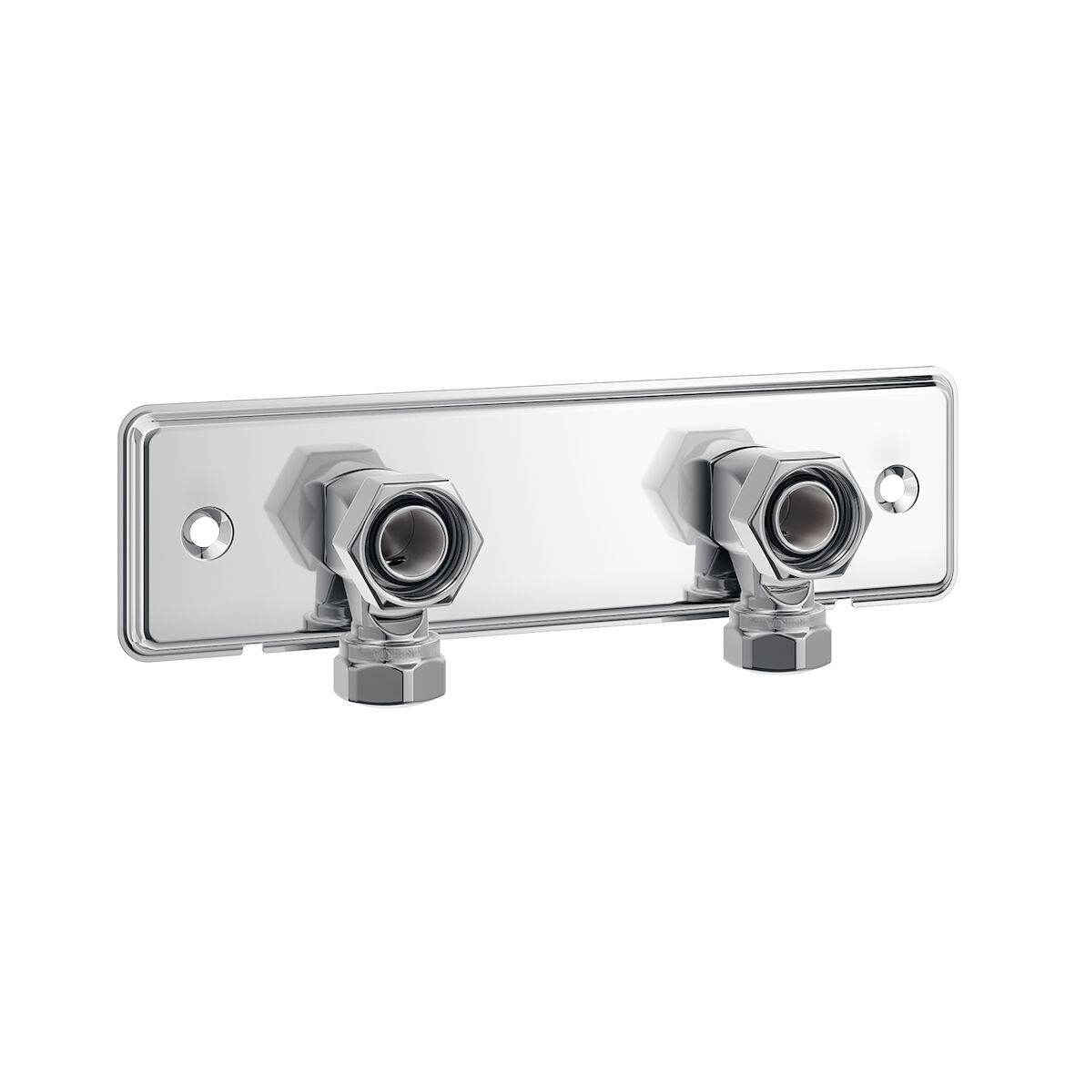 Rostfritt, blankpolerat blandarfäste 100 cc för utanpåliggande rördragning, med vridbara anslutningsvinklar. Ansluter till blandare med M26x1,5 och inlopp med G15. Inkluderar klämringskopplingar för 12/15-rör och VVS-skruv.