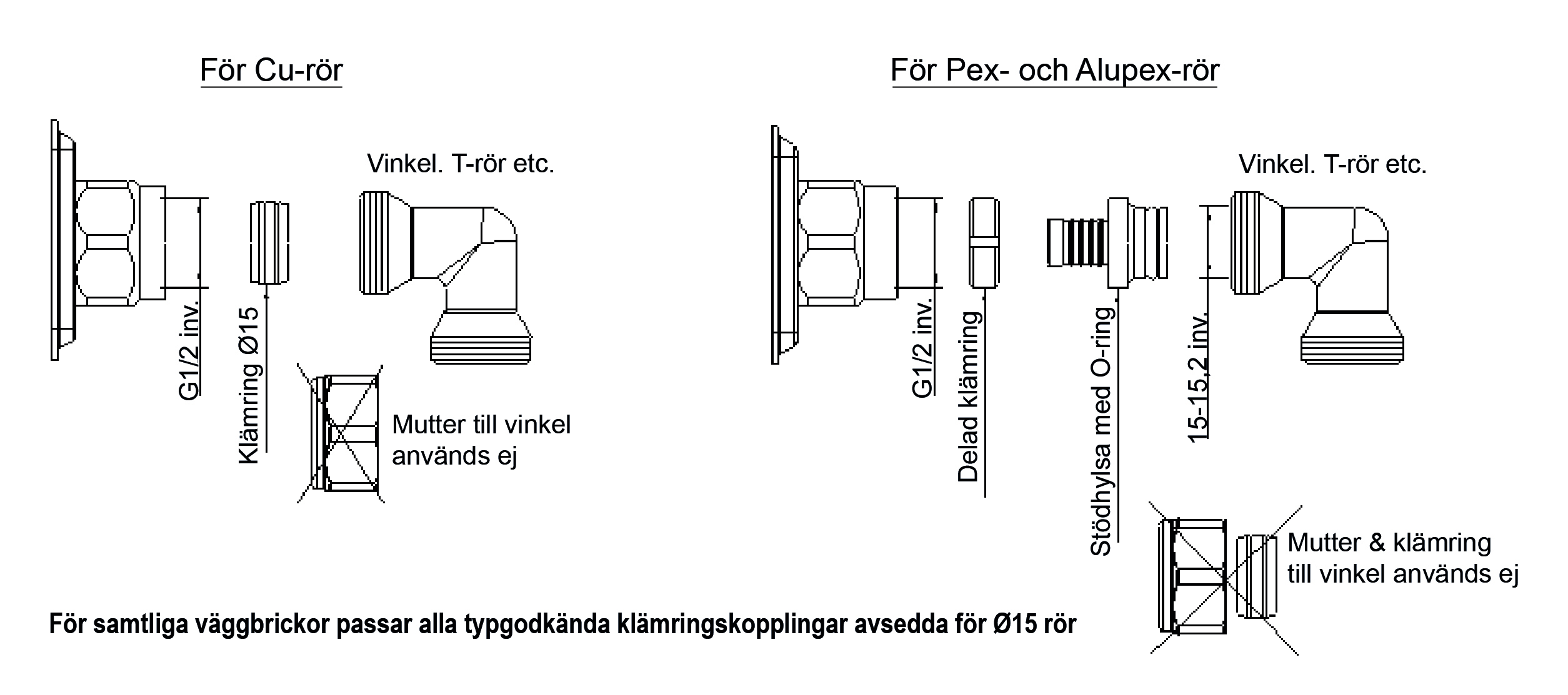 Enkel väggbricka inv. gänga G15. Kopplingssats ingår. Mutter flexibel +/- 1 mm. För Ø 16x2,0-2,2 Pex/Alupex/Pb. Rostfri och blankpolerad. Skruvhål 80cc. Mått:110x45 mm.
