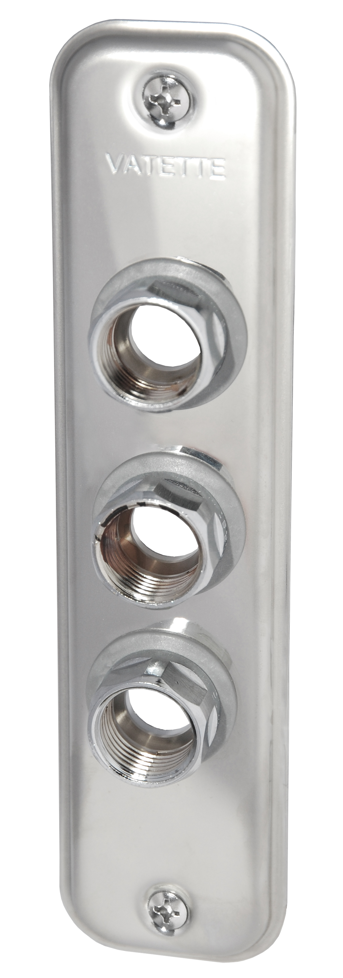 VATETTE VÄGGBRICKA 3-RÖR DY15 för koppar och PEX-rör i dimensionerna 10, 12, 15.Med lekande Vatettemutter Dy 15.Ansluts mot Vatette kopplingar/kulventiler Dy 15.