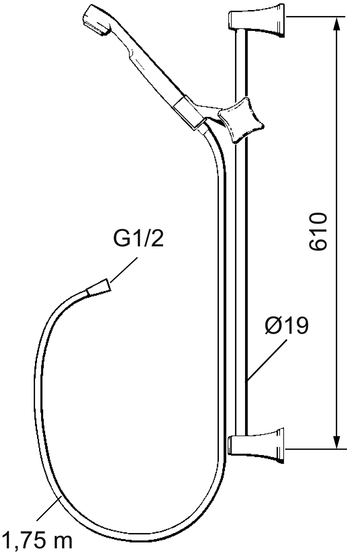 Med 610 mm fkr stång med väggtätning, 1,5 m slang och handdusch