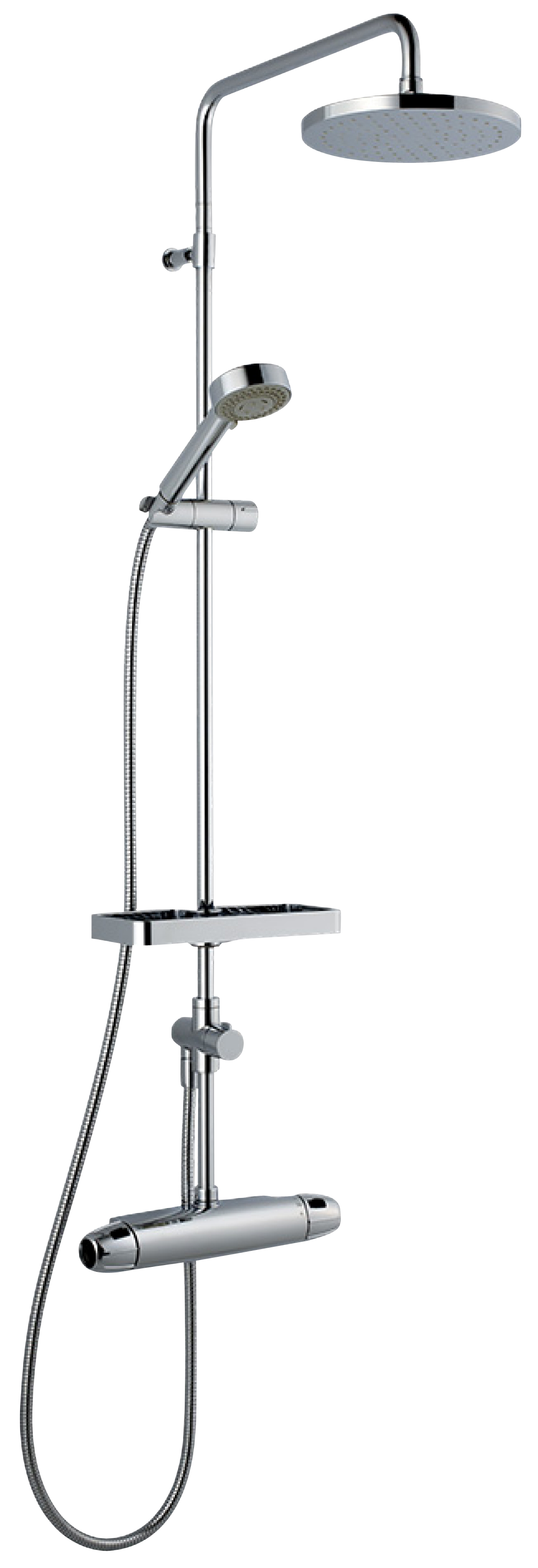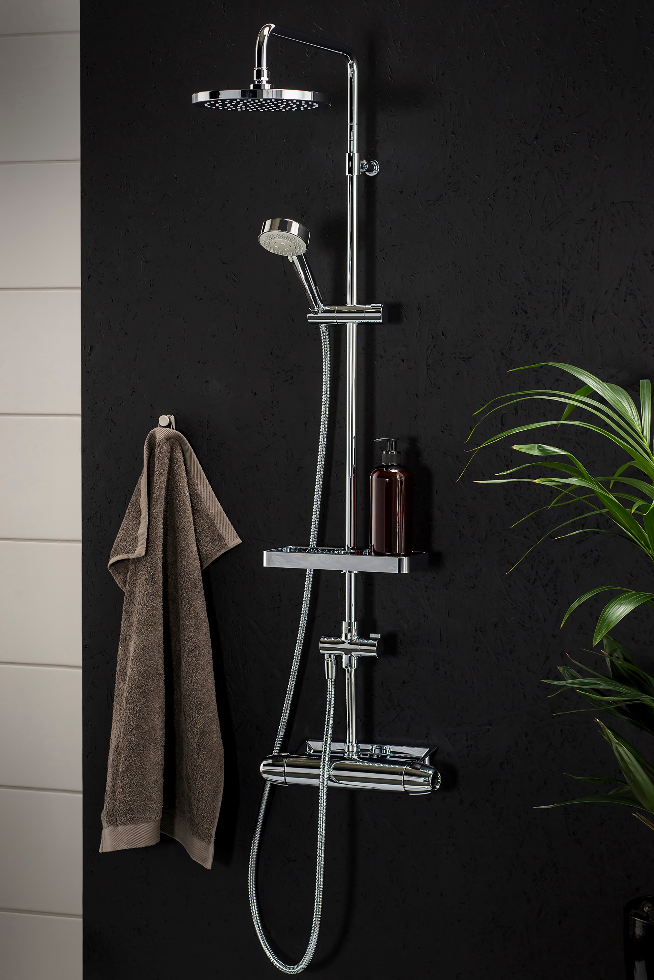 Takduschpaket som inkluderar säkerhetsblandare i ny design med schampohylla, tak- och handdusch med kalkavvisande sil, samt duschstång med väggtätning och tvålhylla. Blandarens nya, stilrena form kompletterar de unika funktioner och den miljöhänsyn som kännetecknar 9000E-serien. Smart teknik spar vatten och energi utan att tumma på bekvämligheten för dig som användare. Slang 1,75 meter.