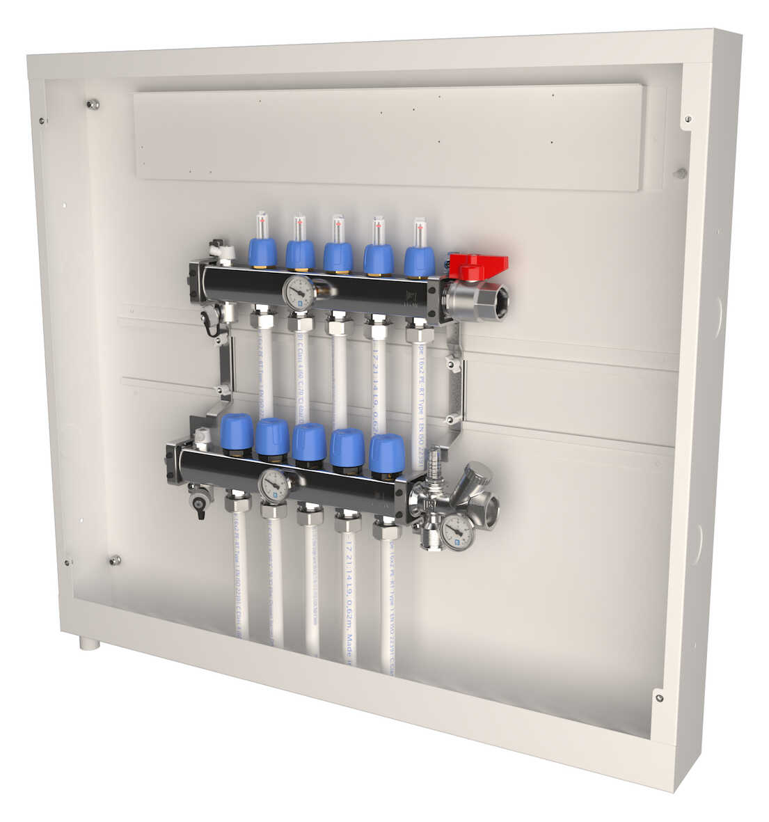 Skåpets gavlar är försedda med knockouthål för ev. sidoanslutning av tillopp och returledning.