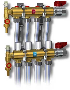 Fördelare i mässing med integrerade injusteringsventiler för inkoppling av 2-12 golvvärmekretsar. Anslutning till huvudkrets kan ske valfritt från höger eller vänster sida. Byggdjup inkl. konsol - 105 mm, c/c fördelarrör 210 mm, c/c anslutningar 50 mm. Värmekretsfördelaren ska kompletteras med: LK Anslutningskopplingar 16x2 (RSK 241 74 61), 12x2 (RSK 241 74 62) alternativt 20x2 (RSK 241 79 06) samt 2 st avstängningsventiler, RSK 241 75 50. Som tillbehör finns även LK Anslutningskopplingar för PE-X rör 20x2,8 samt för kopparrör 12x1,0 resp. 15x1,0.