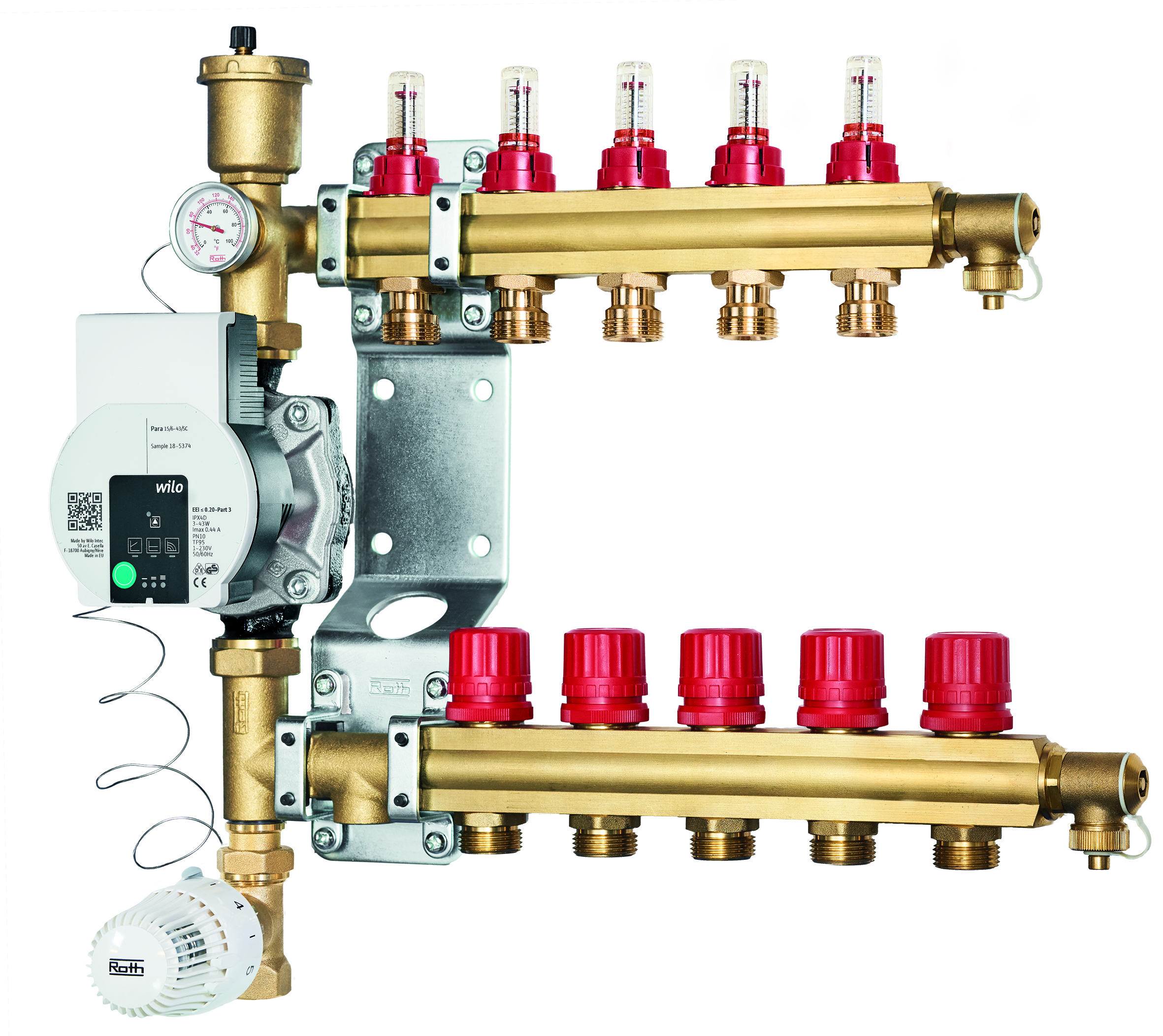 Roth ShuntUnit-5 Komplett enhet med pump och fördelare med flödesmätare.Med termisk framledningsbegränsning.Kapacitet: Upp till 100 m².Max. yta per slinga beror på val av rördimension och förläggningssätt.
