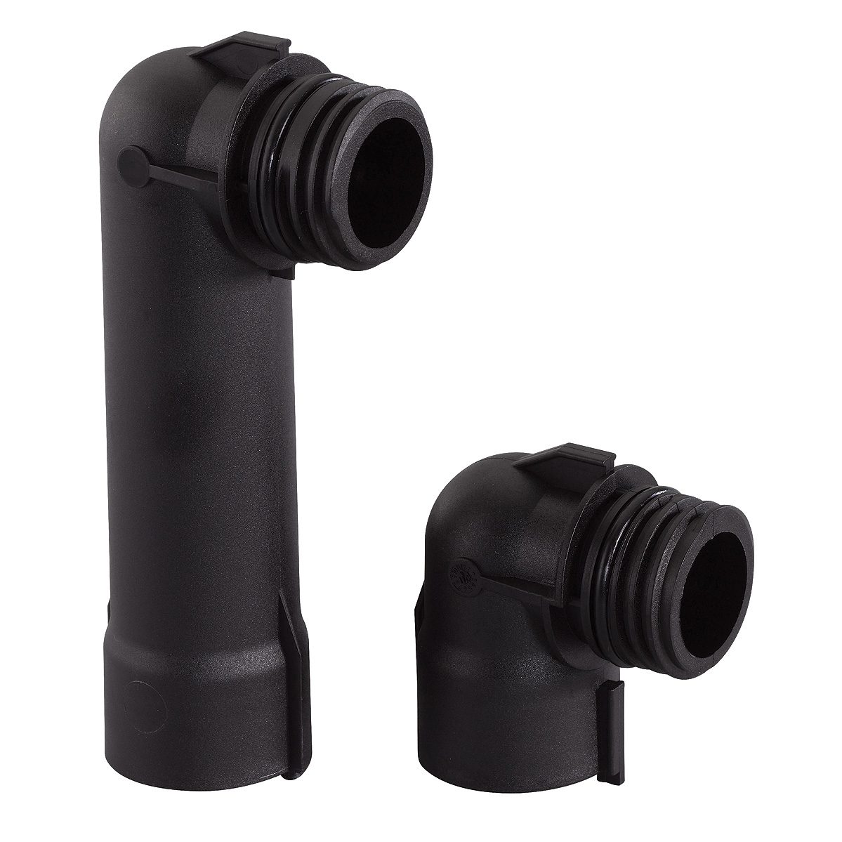 För anslutning av matarledningar i vinkel. Levereras i par med en kort och en lång vinkel. Kompletteras med Uponor Vario PLUS Distansset RSK nr 2418977 vid anslutning ovanifrån.