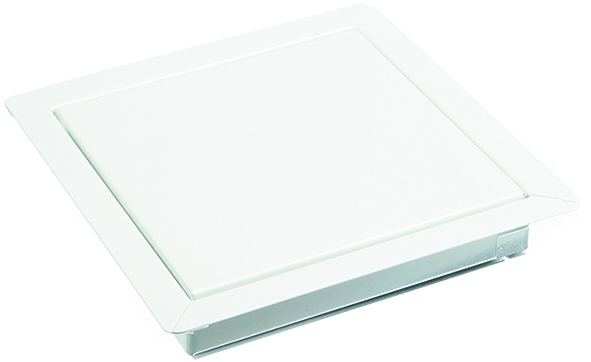 Består av ram, lucka och fästbleck. Galvanserad plåt som vitlackerats. Ramen fästs i vägg och tak. För skivstorlekar mellan 12,5-52 mm. Fd artnr 792002X