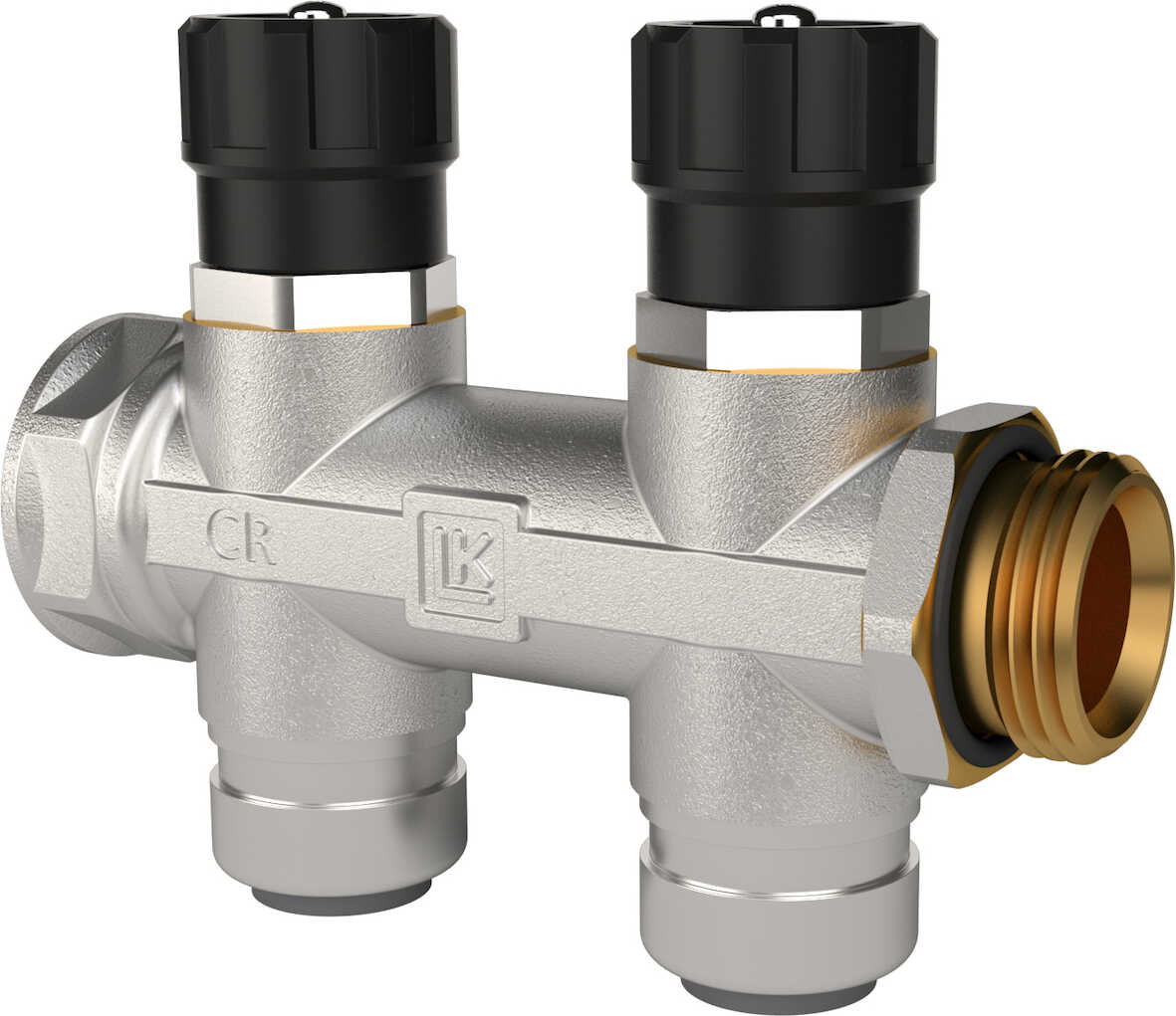 Påbyggnadsbar fördelare för värme- och tappvattensystem. Monteras på vägg eller tak med LK Fördelarkonsol eller inuti ett LK Fördelarskåp UNI. Tillverkad av avzinkningsbeständig mässing, förnicklad.
