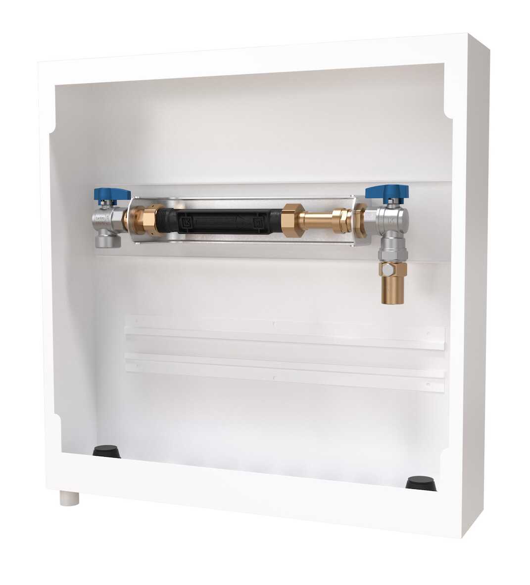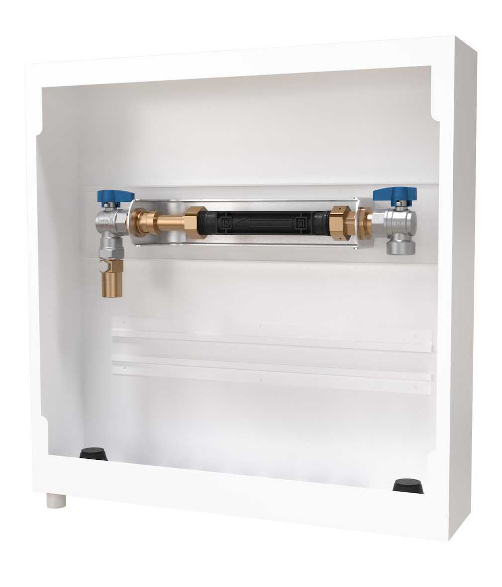 Samtliga kopplingar samt kulventiler är av avzinkningshärdig mässing. Skåpet har vattentät botten med 50 mm hög framkant och är godkänt enligt NT VVS 129. Skyddspåse att trä över skåpet under byggtiden ingår.