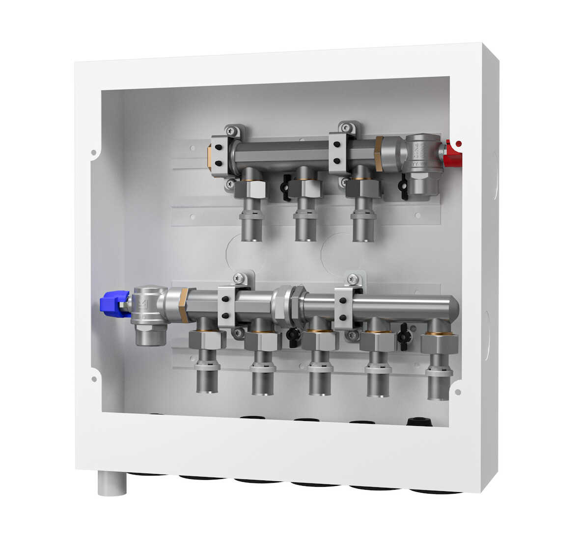 Samtliga fördelare, kopplingar samt kulventiler är av avzinkningshärdig mässing. Skåpet har vattentät botten med 50 mm hög framkant och godkända enligt NT VVS 129. Skyddspåse att trä över skåpet under byggtiden ingår.