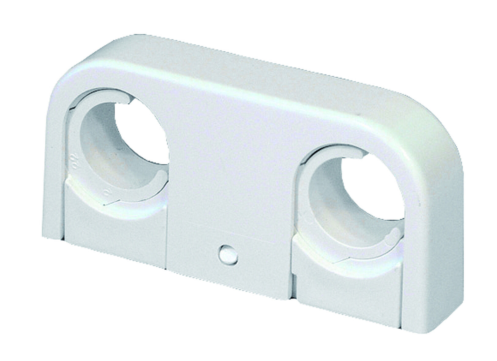 Rörklamma i plast c/c 60 avsedd för två kopparrör med dimension Ø22/28 mm. Avlägsna insatserna vid installation av Ø28 mm rör. Våtrumstätning ingår.