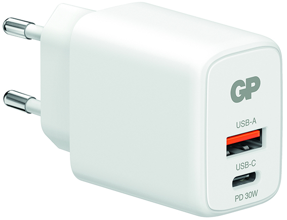Laddar två enheter samtidigt. Dubble portar. En 30W USB C-port och en 18W USB-A-anslutning. Kompatibel med de flesta enheter, t ex smartphones, surfplattor och Vision Pro. Med överspänningsskydd. Vit