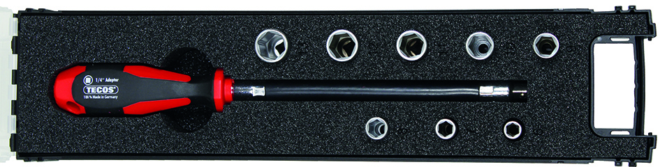 Sats med 6, 7, 8, 9, 10, 11, 12 och 13 mm hylsa och böjbar hylsmejsel. Alla hylsnycklar passar till kranmuttrar i varierande storlek.
