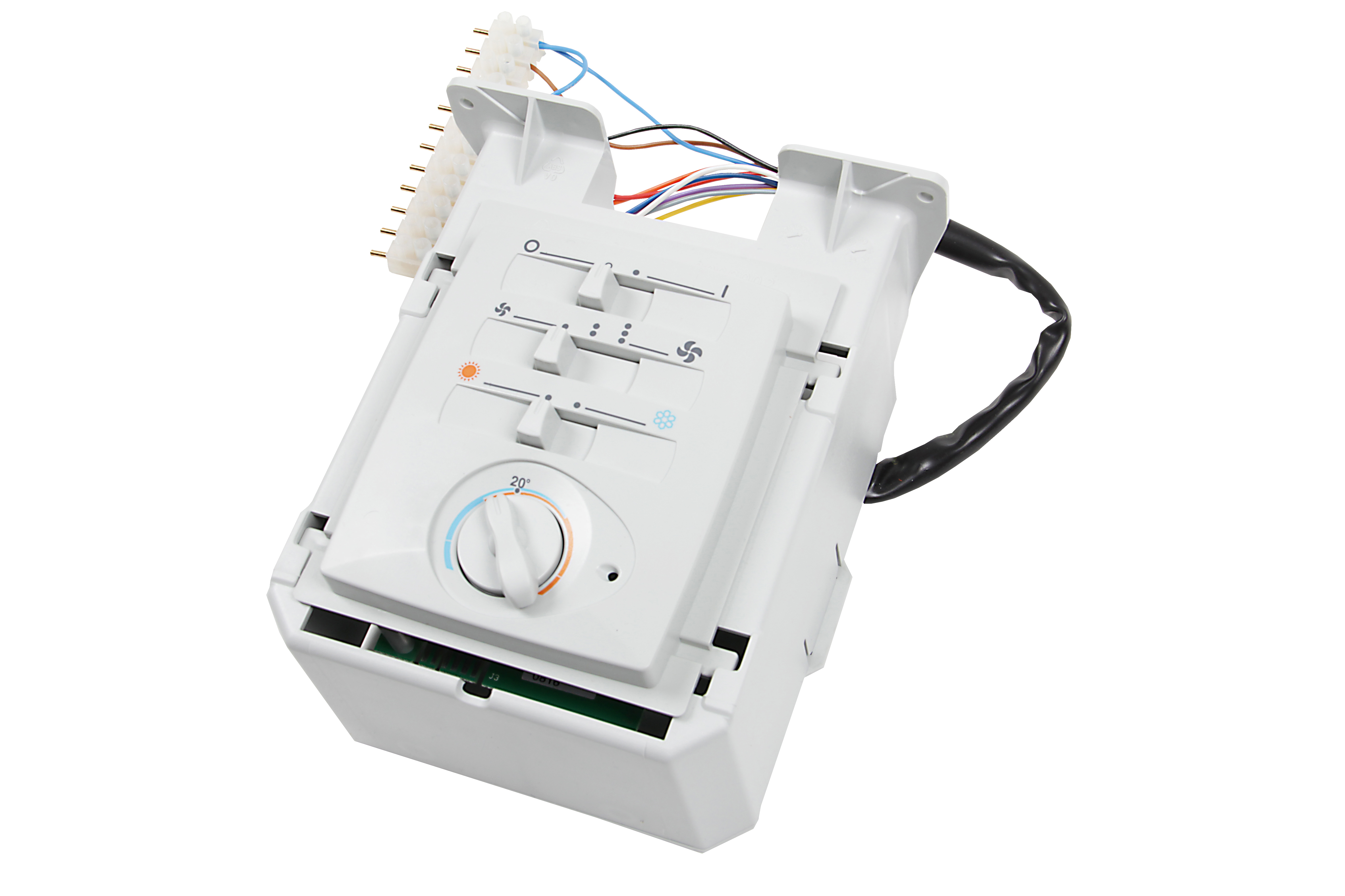 Termostat och hastighetsomkopplare för montering i Carisma fläktkonvektor, försedd med snabbanslutning.