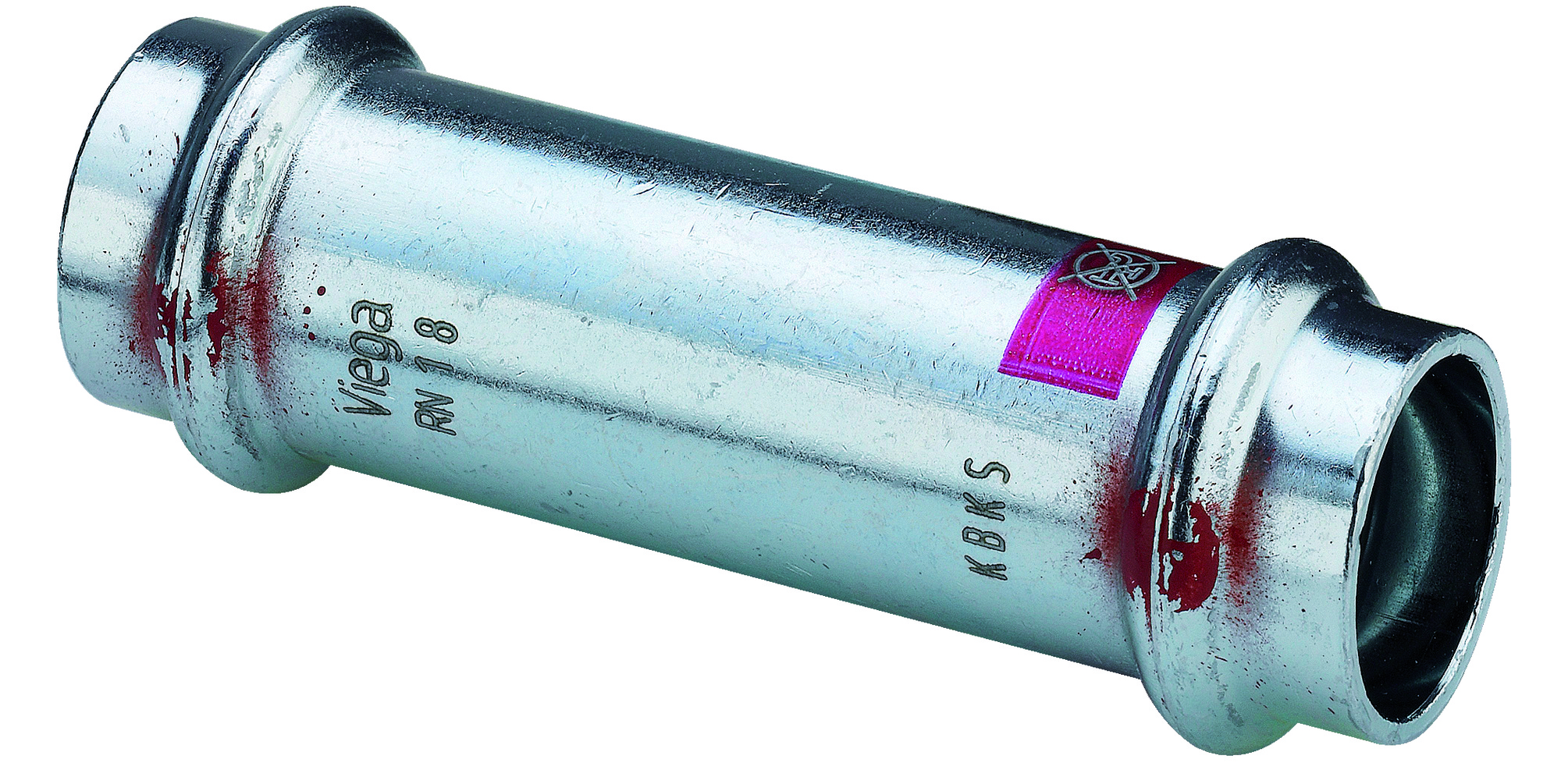 Formstabilt för snabba och rena installationer av värme- och industrianläggningar. Kall förbindning på några sekunder med alla de fördelar det innebär. Inga förbindningsställen genom lödning eller svetsning och därför heller ingen brandfara särskilt viktigt vid saneringar. Prestabo-kopplingar är försedda med SC-Contur synlig testsäkerhet. SC-Contur är märkt med röd färg. Opressade förbindningar upptäcks i tid gennom synligt vattenläckage vid påfyllning av anläggningen inom hela tryckområdet från 1,0 till 6,5 bar. Vid kontroll med luft eller inerta gaser från 110 mbar till 3,0 bar kan en synlig tryckminskning avläsas på manometern. Prestabo presskopplingar är tillverkade av olegerat stål, utvändigt galvaniskt förzinkade med en tjocklek på zinkskiktet på 8-15 micro; (blåförkromade). Prestabo-systemet omfattar två varianter av systemrör: systemrör av olegerat stål utvändigt galvaniskt förzinkade systemrör av olegerat stål utvändigt galvaniskt förzinkade med en plastmantel i polypropen (PP) i vitt (RAL 9001). Rörens och kopplingarnas storlek: 15, 18, 22, 28, 35, 42 och 54 mm, Med hjälp av de elhydrauliska systempressverktygen, och de nätoberoende batteridrivna systempressverktygen skapas en olöslig, kraftbetingad förbindning. Användningsområde för Prestabo: värmeanläggningar slutna kyl- och värmekretsar tryckluftsanläggningar industrianläggningar. Märkning av systemrören och presskopplingarna. För att undvika förväxlingar med Sanpress Inox-artiklar (i rostfritt stål) har alla Prestabo-presskopplingar och systemrör märkts med en röd symbol "Ej tillåtet för dricksvatteninstallationer". Vidare är SC-Contur märkt med röd färg. Maximal arbetstemperatur och -tryck för respektive användningsområde framgår av de tekniska underlagen. Vid industriell användning där det ställs mycket höga krav rekommenderar vi kontakt med Viega A/S.