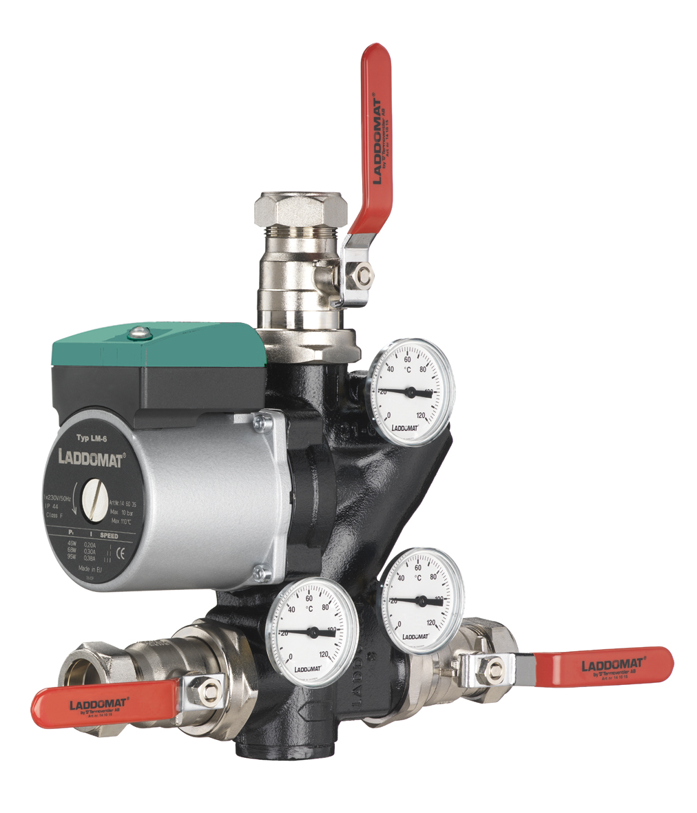 För laddning med "ren" vedpanna, maxeffekt 80 kW, till komplett tank, försedd med varmvattenberedare och shunt till värmesystemet. Laddomat 21 gör att pannan snabbt når ca 80°C arbetstemperatur. Därefter sker överladdning till tanken med hög jämn temperatur. Det som ger Laddomat 21 den mest uppskattade egenskapen är den inbyggda automatiska strypningen av internflödet. Denna strypfunktion ser till att hela tanksystemet blir fulladdat. Efter avslutad eldning tar Laddomat 21 tillvara på en del av eftervärmen i panna och glödbädd genom att det heta vattnet i pannan förs över med självcirkulation till tanken. Energin hamnar i tanken i stället för i skorstenen. Den inbyggda backventilen med extra stort genomlopp laddar tanken vid strömavbrott. Den öppnar automatiskt och för över pannvärmen med självcirkulationskraften. Laddomat 21-60 levereras som standard med EPP-isolering och riktiga avstängningsventiler, R32, med spak. De extra stora öppningarna i kulventilerna bidrar till den goda självcirkulationen.
